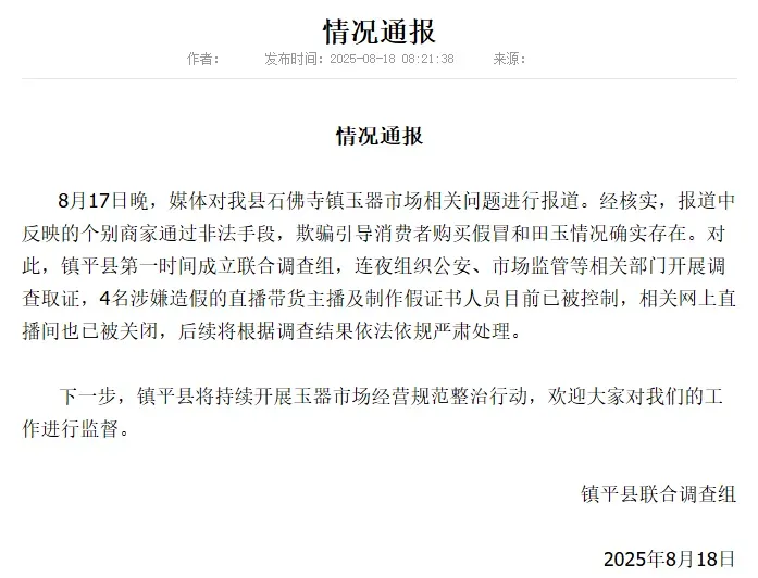 8月17日晚,媒体对我县石佛寺镇玉器市场相关问题进行报道。经核实,报道中反映的个别商家通过非法手段,欺骗引导消费者购买假冒和田玉情况确实存在。对此,镇平县第一时间成立联合调查组,连夜组织公安、市场监管等相关部门开展调查取证,4名涉嫌造假的直播带货主播及制作假证书人员目前已被控制,相关网上直播间也已被关闭,后续将根据调查结果依法依规严肃处理。