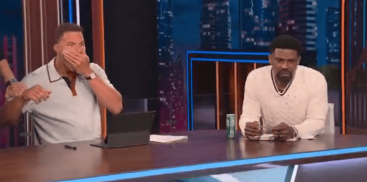 美媒NBAonPrime晒出了解说席这边两位嘉宾的反应:格里芬捂嘴不敢置信&热火名宿哈斯勒姆无语。